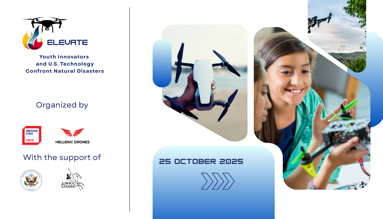 Με την υποστήριξη της Πρεσβείας των ΗΠΑ στην Αθήνα, τα American Spaces σε Ξάνθη, Βέροια, Πειραιά και Θεσσαλονίκη, σε συνεργασία με το Κολλέγιο Ανατόλια και τη Hellenic Drones, εγκαινιάζουν το Elevate—μια δυναμική πρωτοβουλία για τη νεολαία με επίκεντρο τη χρήση αμερικανικής τεχνολογίας για την πρόληψη και αντιμετώπιση πυρκαγιών και φυσικών καταστροφών.