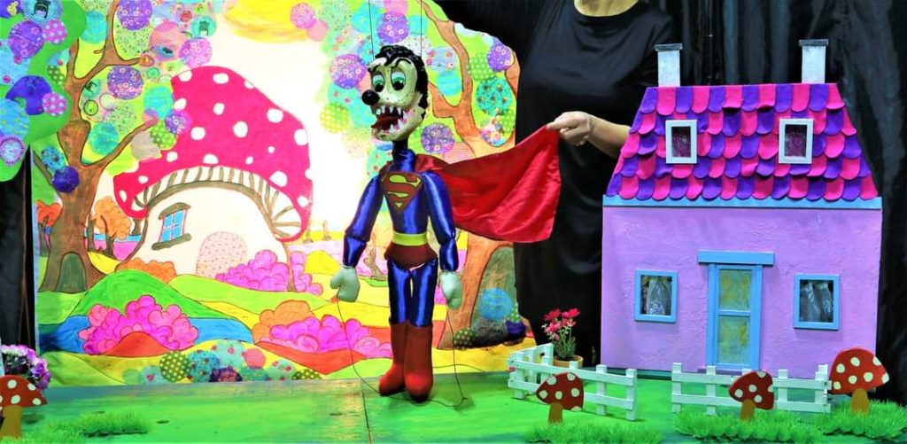 Η ομάδα κουκλοθέατρου JINX διασκευάζει το γνωστό παιδικό παραμύθι. Πρόκειται για μία κωμική παράσταση, με αποκριάτικη ατμόσφαιρα και τις κούκλες να ντύνονται και καρναβάλια, με ιδιαίτερη έμφαση στην επιλογή των κουκλών, διαλόγων και σκηνικών, ώστε να το παρακολουθήσουν ευχάριστα ακόμα και πολύ μικρές ηλικίες παιδιών. Οι κούκλες είναι επιτραπέζιες και μαριονέττες 50-80 εκ. ύψους, τα σκηνικά μεγάλα και εντυπωσιακά και οι κουκλοπαίτες συμμετέχουν διαδραστικά στην εξέλιξη της ιστορίας, γεγονός που κάνει την παράσταση ακόμα πιο κωμική και ευχάριστη και για τους ενήλικες. Στην μουσική επένδυση της παράστασης προτιμήθηκαν κομμάτια κλασσικής μουσικής. Τέλος, ο πρωταγωνιστής λύκος είναι γκαφατζής, σκανδαλιάρης και εμφανίζεται σε 3 διαφορετικούς ρόλους-έκπληξη!